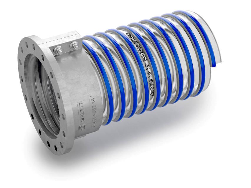 Shark hose. 8"/Ø203mm. Transparent PVC slange m/ blå PVC Spiral.
