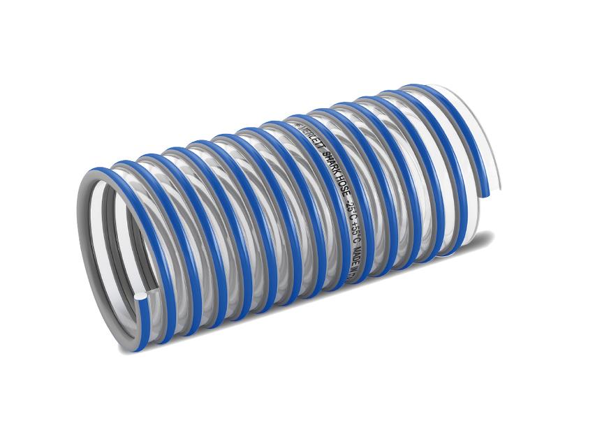 Shark hose. 6"/Ø152mm. Transparent PVC slange m/ blå PVC Spiral.