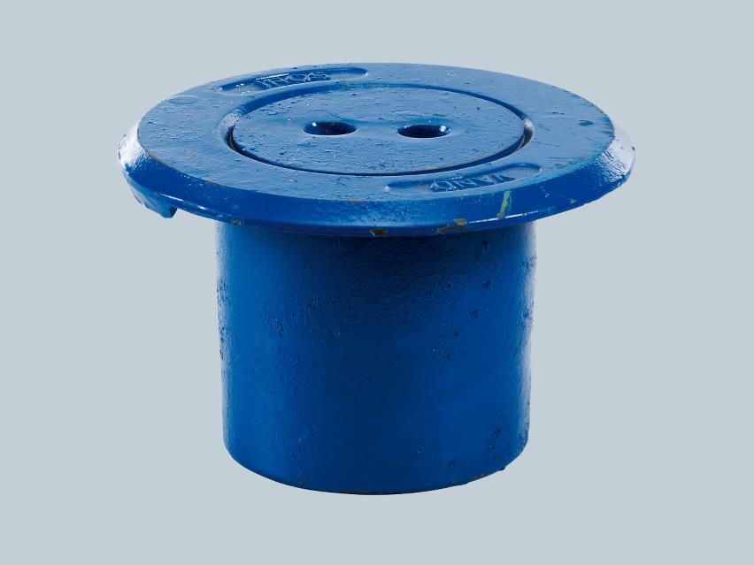 Ø110 Kørebaneafslutning i støbejern, blå. Med monteret PE rør for bedre indstøbning.